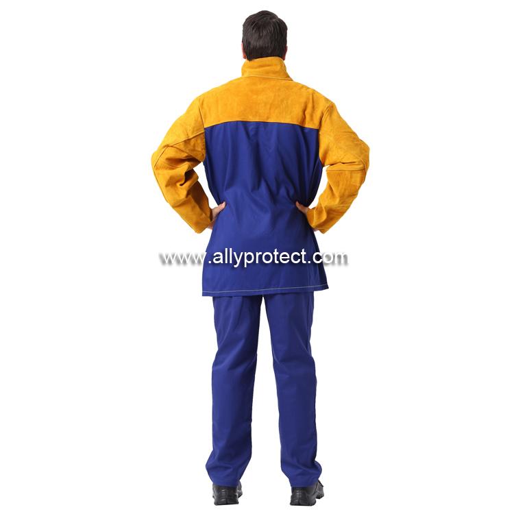 - 產(chǎn)品描述: [ AP ]前幅和衣袖采用金黃色牛二層皮,后幅采用藍(lán)色防護(hù)阻燃布,專為焊工在炎熱環(huán)境下工作而設(shè)計。